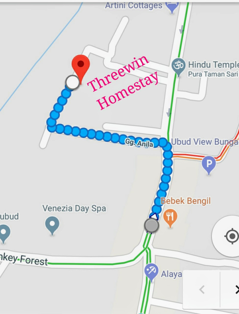 this is a small side street of Jalan Hanoman in Ubud only 200 meters from the famous Bebek Bengil (Dirty Duck) restaurant and next to it is the also famous CoCo Supermarket where most taxis pickup and drop off their customers.